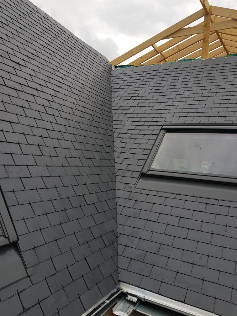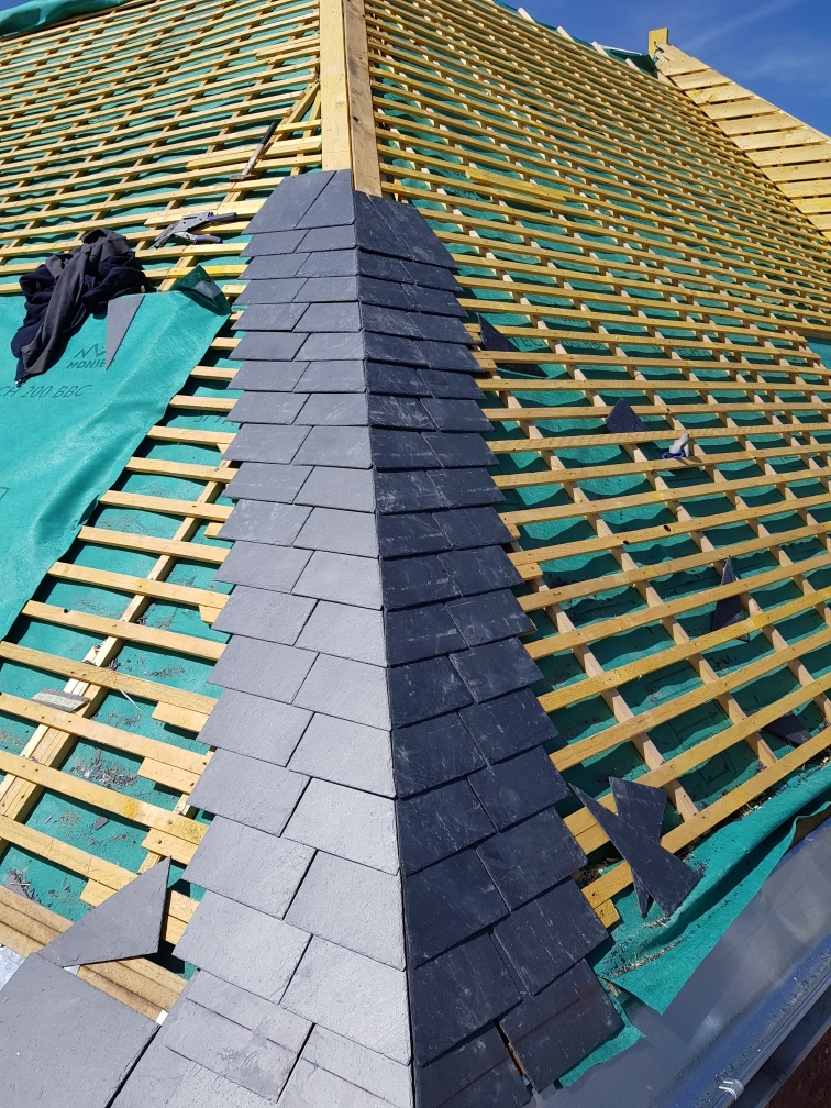 Récupération de tuiles anciennes type vieille panne, lucarne en zinc noir à joint debout